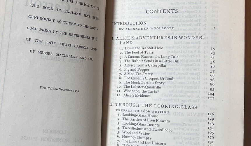 The Complete Works of Lewis Carroll with an Introduction by Alexander Woollcott and the Illustrations by John Tenniel. Published in London by the Nonesuch Press in 1939.