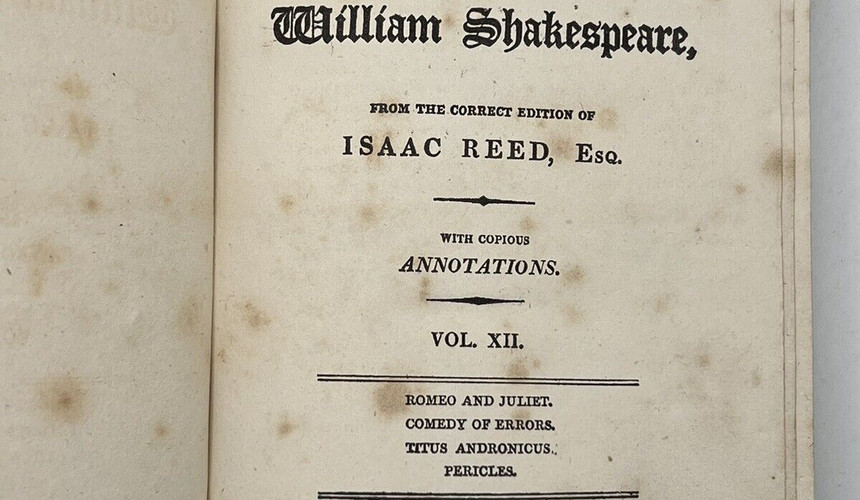 The Dramatic Works of William Shakespeare, from the Correct Edition of Isaac Reed, Esq. With Copious Annotations. Twelve Volumes. London; Printed for J. Walker, G. Offer, Sharpe and sons, etc.; 1820.