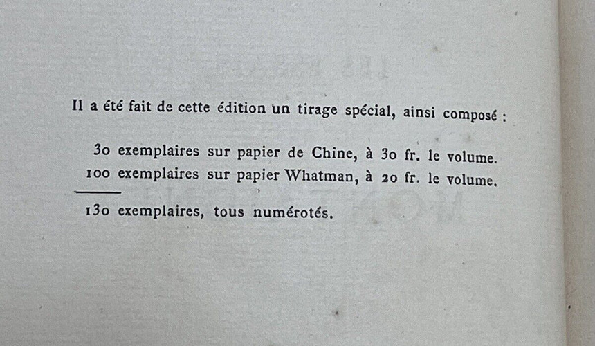 This edition was made into a special edition, compassed as follows: 30 copies on China paper, at 30 fr. volume; 100 copies on Whatman paper, at 20 fr. volume; 130 copies, all numbered.