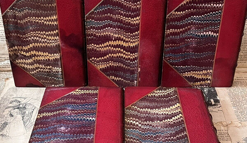 Bindings VG+ with slight damage to the head of the spine of volume one and light shelf wear. Boards with some discolouration, the rear board of the first volume being the most affected. Shows beautifully on the shelf. Some discolouration to page edges with top gilt page edges near fine/fine. Dampstaining throughout the bottom of the text block to volumes 1, 3, 4, most affecting 1. Light foxing towards preliminaries and endpapers, else text blocks mildly toned but clean.