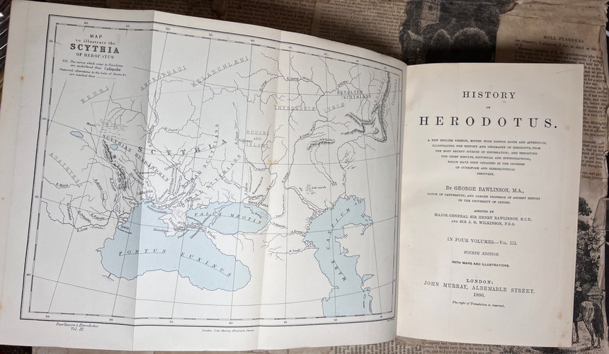 History of Herodotus. A New English Version, Edited with Copious Notes and Appendices, Illustrating the History and Geography of Herodotus, From the Most Recent Sources of Information; And Embodying the Chief Results, Historical and Ethnographical, Which Have Been Obtained in the Progress of Cuneiform and Hieroglyphical Discovery. By George Rawlinson, M.A. Assisted by Sir Henry Rawlinson, K.C.B., and Sir J. G. Wilkinson, F.R.S. In Four Volumes. Fourth Edition. London; John Murray; 1880.