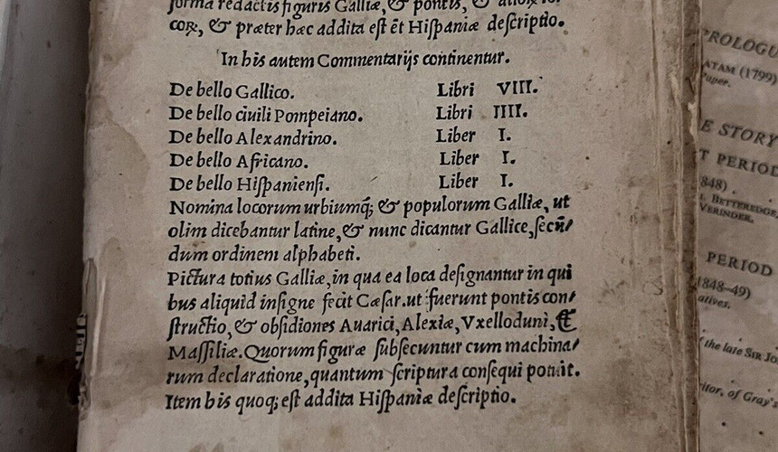 Julius Gaius Caesar: Commentaria Caesaris prius a locundo impressioni data, posterius a nobis diligentissime reuisa, et cum exeplaribus eiusde collata, restitutis omnibus locis, quae per incuriam ab ijs quiea impressere, uel relicta uel errata fuerunt, sic ut ne qdenunn iota ear castigation desit in nostris. Et ut par fuerat, in fine totius operis, repositis et etia in melioren forma redactis figuris Galliae, et pontis, et alior locor, et praeter hoc addita est et Hispaniae descripto.