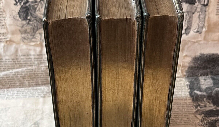 Minor scuffing and scratches on spines with some sunning. All boards securely attached. Very minor scratches, scuffing and rubbing on boards. Minor mark on the front board of volume one. Two bookplates attached to the front pastedown in all volumes. Light toning and very minor foxing on endpapers. Very small hole in the bottom corner from front pastedown to page ix. Light toning and very minor foxing on frontispiece and title page in volume one. Text block of volume on extremely clean with sporadic and very minor foxing. Text block of volume two very clean with sporadic light toning and sporadic very minor foxing. Text block of volume three toned with sporadic very minor foxing.