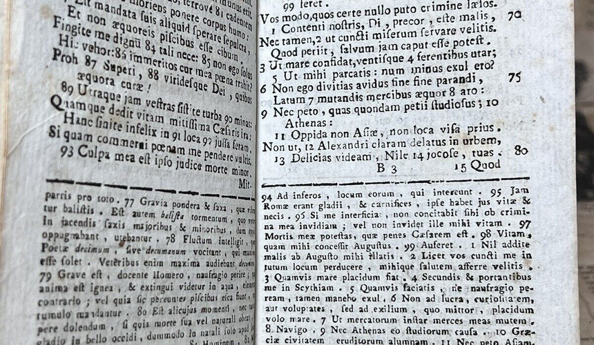 P. Ovidii Nasonis: Tristium Libri V. Cum Notis Novis, ac Perpetuis ad Modum Joannis Minellii. ad Optimos Codices Emendati Et Illustrati Opera, Atquestudio M. Erdmanni Uhsei. Accessit Index Locupletissimus Rerum, & Verborum. Neapoli; MDCCXCVI. Typis Pauli Severini-Boetii. Superium Permissu. & P. Ovidii Nasonis: Epistolarum Ex Ponto. Libri IV. & Ejusdem Ibis Jo. Henric Kromayerus Recensuit, Adnotationibus, ad Modum Joannis Minellii, Nec Non Indice Rerum, & Verborum Infruxit. Neapoli; MDCCXCVI; Typis Pauli Severini-Boetii. Superium Permissu. English: P. Ovidius Nason's Tristium. Book Five. With New Notes and Perpetuals in the Manner of John Minelli. To the Best Codices of the Revised and Illustrated Works, and the Study of M. Erdmann Uhse. Added the Richest Index of Things and Words. Naples; MDCCXCVI (1796); Printed by Paulus Severinus-Boetius. By Permission of the Supreme. & Epistles from Pontus. Book IV & the Same. Ibis Jo Henry Kromayerus. Reviewed, with Annotations, in the Manner of John Minelli, Not Only with a List of Things, But Also with Words. Naples; MDCCXCVI (1796); Printed by Paulus Severinus-Boetius. By Permission of the Supreme.