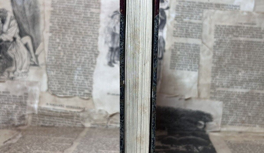 Spine sunned with very minor wear and marks. Minor damage to the right corner of the headcap. Both boards securely attached. Very minor rubbing and marks on boards. Very small leather fragments lacking from both boards (pictured). Page edge lightly toned with minor foxing. Shelf wear. Page joint between preliminary page and half title is mostly torn (pictured - still attached).